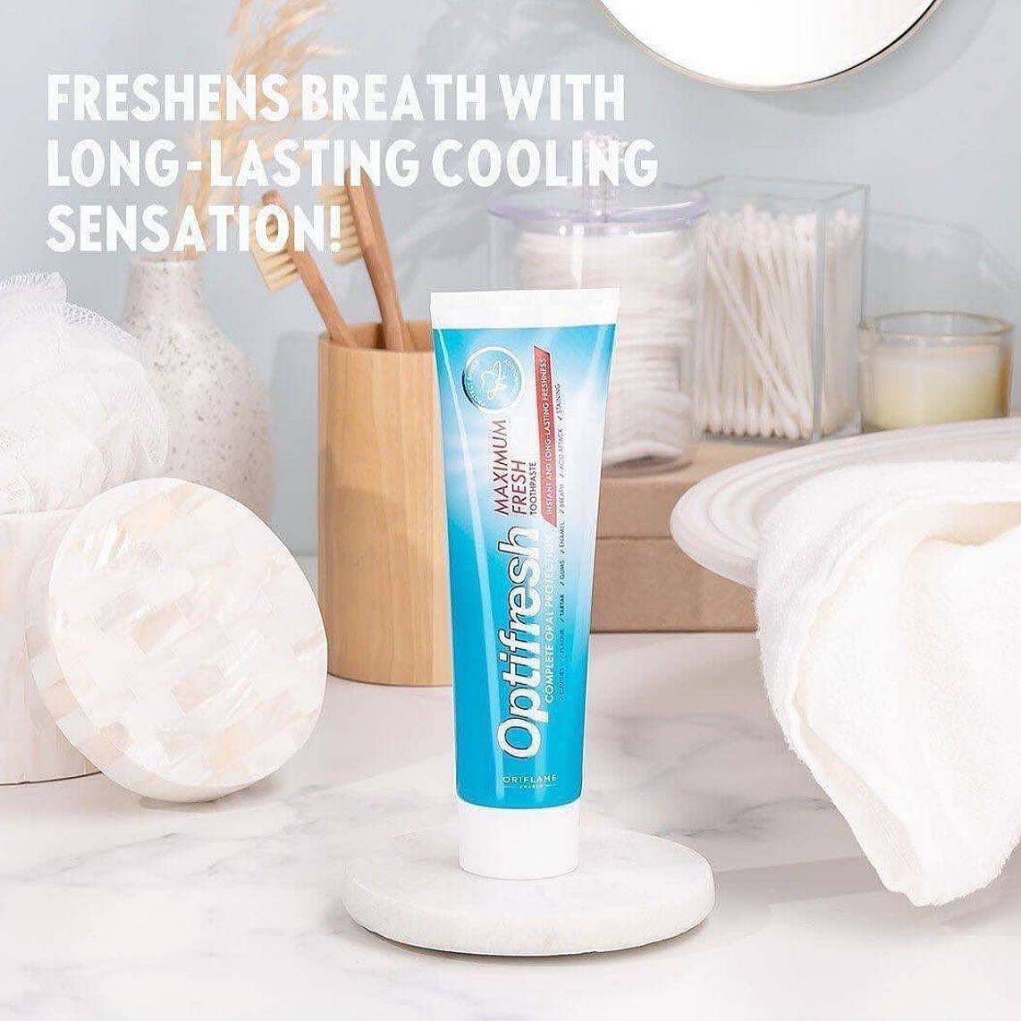 خمیردندان اپتی فرش اوریفلیم مدل ماکسیمم فرش یا تازه کننده نفس، برای خوشبو کردن تنفس و حفظ بهداشت دهان و دندان فرمولاسیون و طراحی شده است. خمیر دندان اپتیفرش اوریفلیم مراقبت کامل از دهان و دندان را برای اعضای خانواده ارائه می دهد. این محصول دندان ها را تقویت و از ایجاد حفره و کرم خوردگی دندان ها جلوگیری می کند. همچنین احساس تازگی نفس را به شما هدیه میدهد و با داشتن دندان هایی سالم، میتوانید با اطمینان خاطر لبخند بزنید. خمیر دندان Maximum Fresh اوریفلیم با فناوری Protect Shield به بهترین صورت از مینای دندان، زبان، گونه ها و لثه ها به مدت 12 ساعت محافظت میکند. ضمن مراقبت از سلامت کل دهان ، طراوت دهان خود را به سطح جدیدی برسانید!